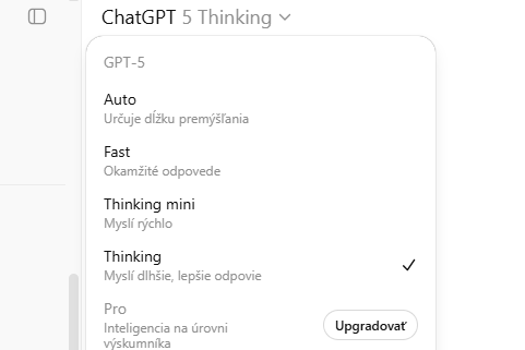 Výber režimov (Auto/Fast/Thinking) sa zobrazuje pri GPT-5 najmä platiacim používateľom.
